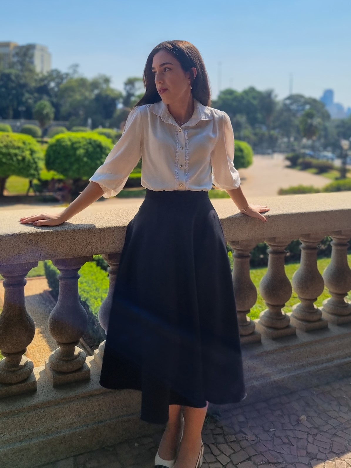 A Saia Jasmim Black é uma peça que traz a elegância e a sofisticação do corte godê, proporcionando um movimento encantador a cada passo. Feita em tecido de alfaiataria de alta qualidade, essa saia midi se destaca pelo seu tom profundo de preto, que evoca sofisticação e versatilidade, inspirado na flor de jasmim, conhecida por sua simplicidade e beleza clássica.