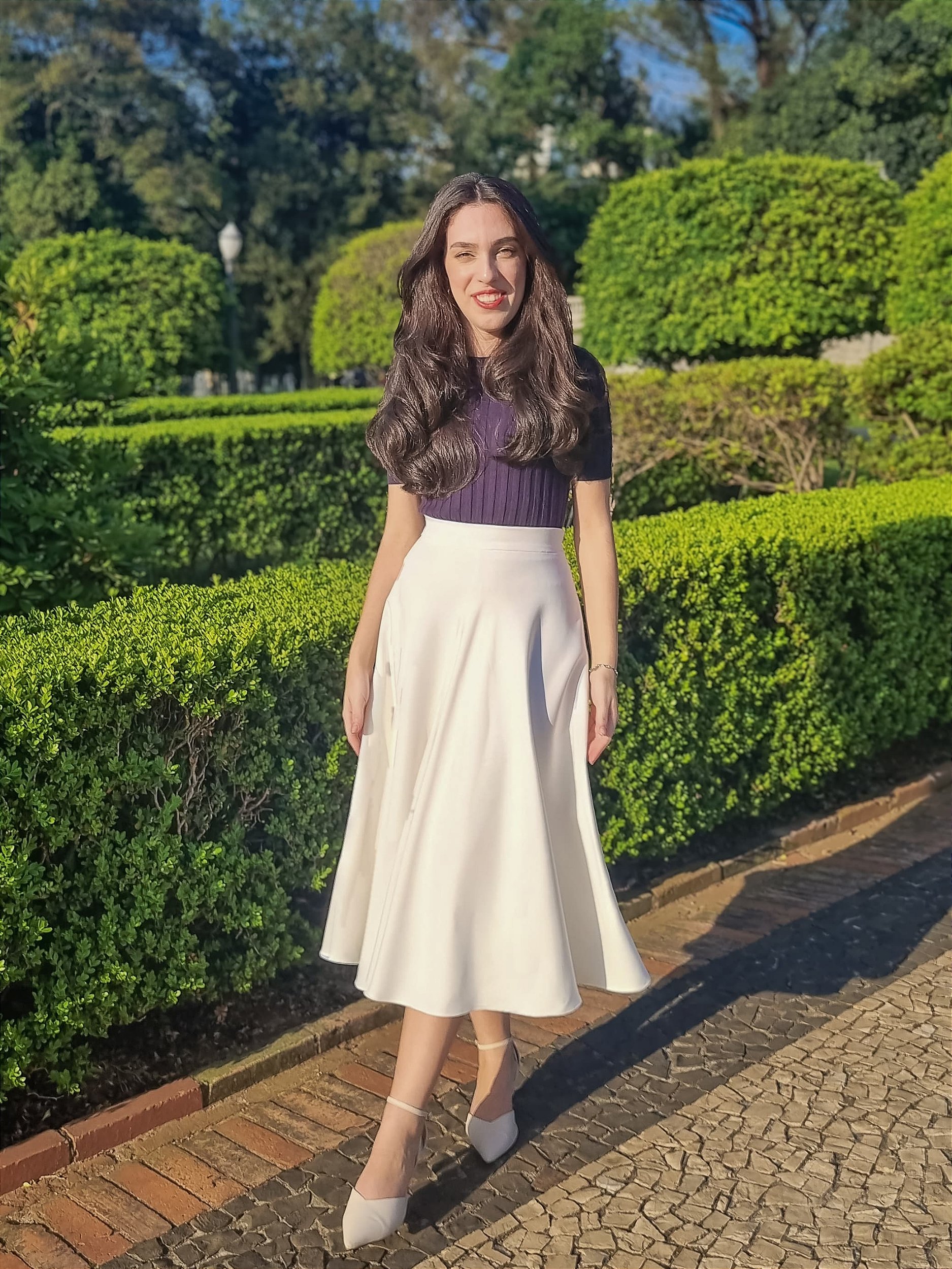 O design da saia apresenta um cós estruturado com elástico na parte de trás, garantindo um ajuste perfeito ao corpo sem comprometer o conforto. Por ter um tom claro, esta saia possui forro até a barra, garantindo a discrição e não possui bolsos. O fechamento é realizado por um zíper invisível na lateral, mantendo a estética simples e, ao mesmo tempo, sofisticada. Com um corte godê amplo, a Saia Jasmim Ivory é ideal para quem busca um look elegante e versátil, que pode ser usado em diversas ocasiões, sempre com muito estilo.