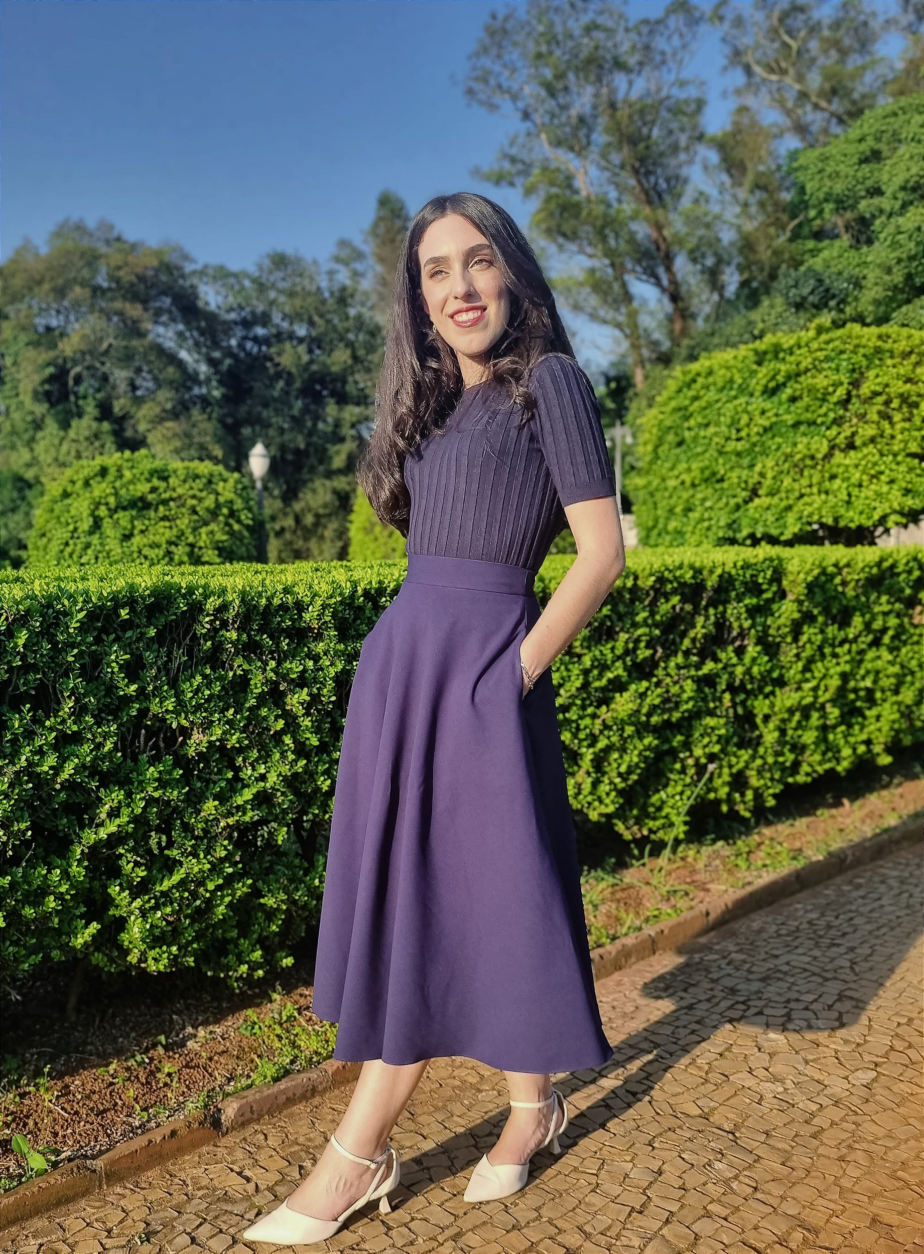 O design da saia apresenta um cós estruturado com elástico na parte de trás, garantindo um ajuste perfeito ao corpo sem comprometer o conforto. Os bolsos embutidos adicionam praticidade à peça, enquanto o fechamento é realizado por um zíper invisível na lateral, mantendo a estética simples e, ao mesmo tempo, sofisticada. Com um corte godê amplo, a Saia Jasmim Navy é ideal para quem busca um look elegante e versátil, que pode ser usado em diversas ocasiões, sempre com muito estilo.
